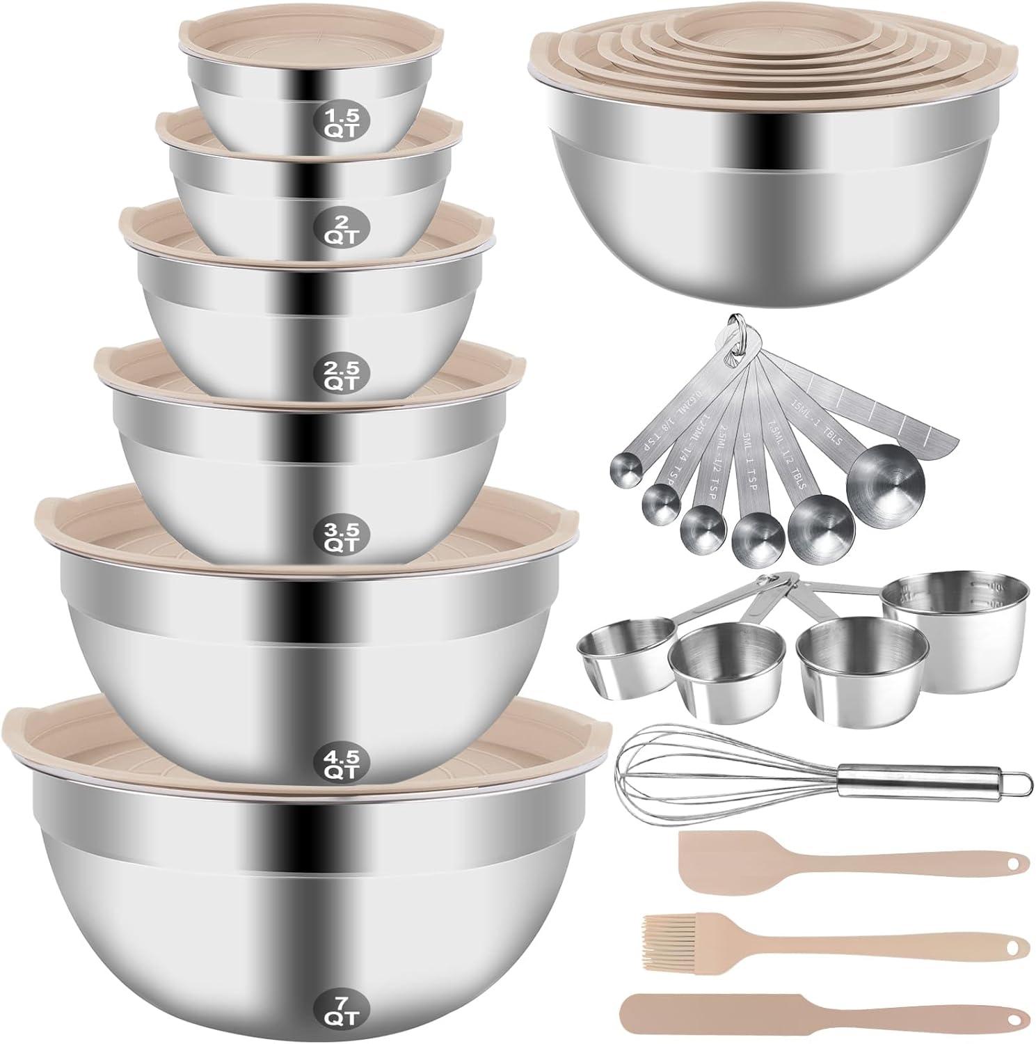 1. Duradero y de alta calidad: el juego de cuencos mezcladores WEPSEN caqui está fabricado con interior con acabado de espejo y exterior con acabado mate, cuenta con un aspecto atractivo y elegante que mejora tu cocina. Hecho de acero inoxidable de alta calidad para un uso duradero, que es resistente a abolladuras y a la corrosión, fácil de limpiar. 2. Varios tamaños para todas las tareas: el juego de cuencos para mezclar incluye 6 tamaños (7, 4.5, 3, 2.5, 2, 1.5QT), por lo que es fácil encontrar el tazón adecuado para cualquier tarea de cocina o necesidad de almacenamiento de alimentos. Con 6 tapas herméticas, cepillo para polvo para untar, espátula esparcida, espátula flexible, batidor de huevos, 4 tazas medidoras y 6 cucharas medidoras, los cuencos anidados son ideales para mezclar, lanzar, preparar, servir alimentos todo en una sola herramienta. 3. Tapas herméticas y apilables para ahorrar espacio: tapas herméticas que se ajustan perfectamente para mantener un sellado hermético y mantener los alimentos frescos, por lo que este juego se puede utilizar como cuencos de almacenamiento en seco con tapas puestas. Estos cuencos de metal están diseñados para ser anidados juntos y ofrecen un almacenamiento eficiente en el espacio para mantener ordenados los armarios de cocina. Fácil de limpiar a mano y apto para lavaplatos. Lavar a mano las tapas para evitar que se deformen.