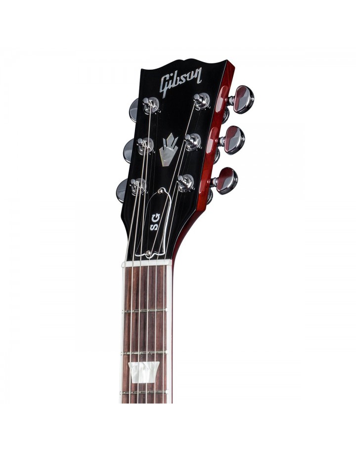 The headstock has a traditional appearance, with a black and white bell truss rod cover with ""SG"" stamped on, alongside the usual Gibson logo decal and crown. For total tuning accuracy, the SG is equipped with locking Grover Kidney-button tuners with a precise 14:01 gear ratio.
