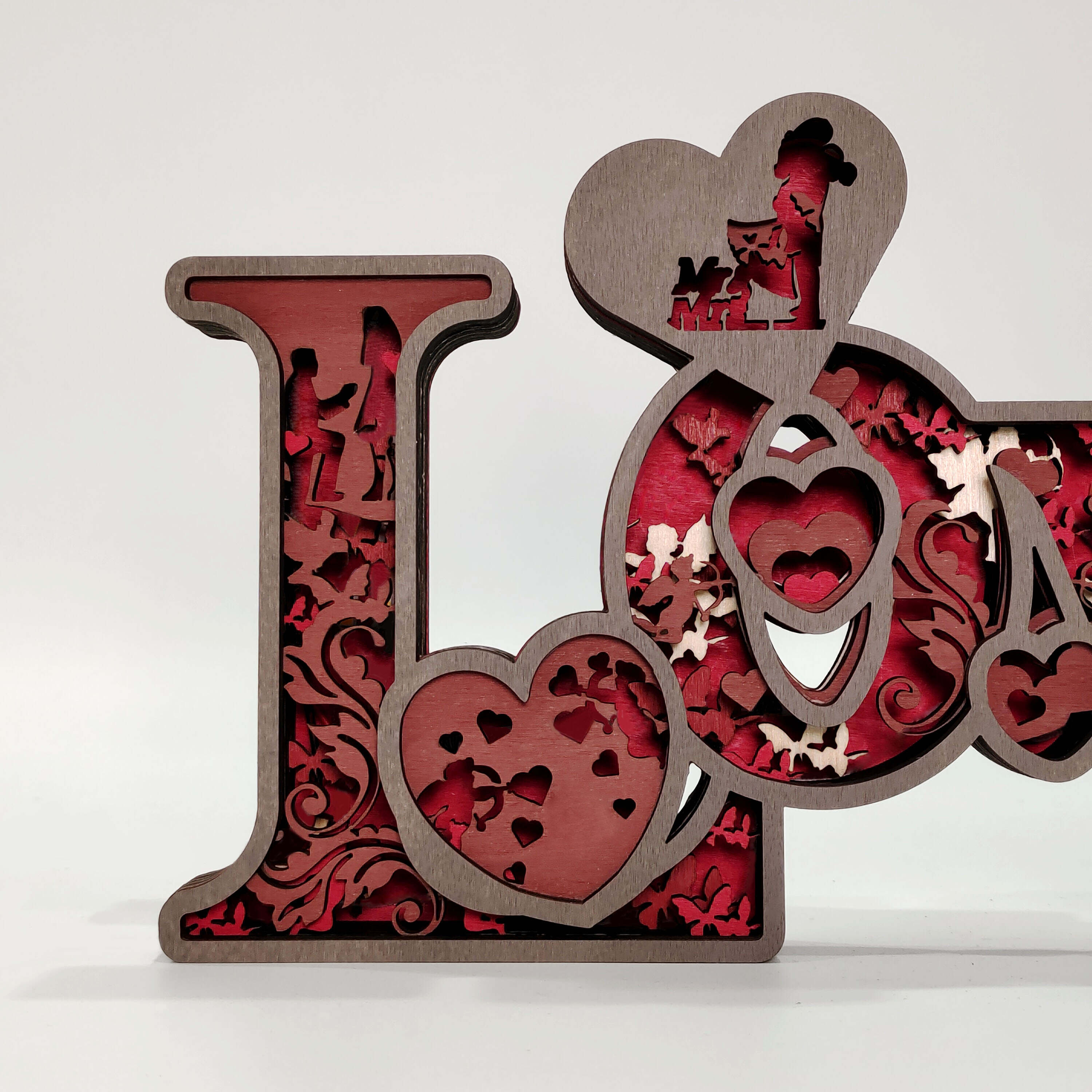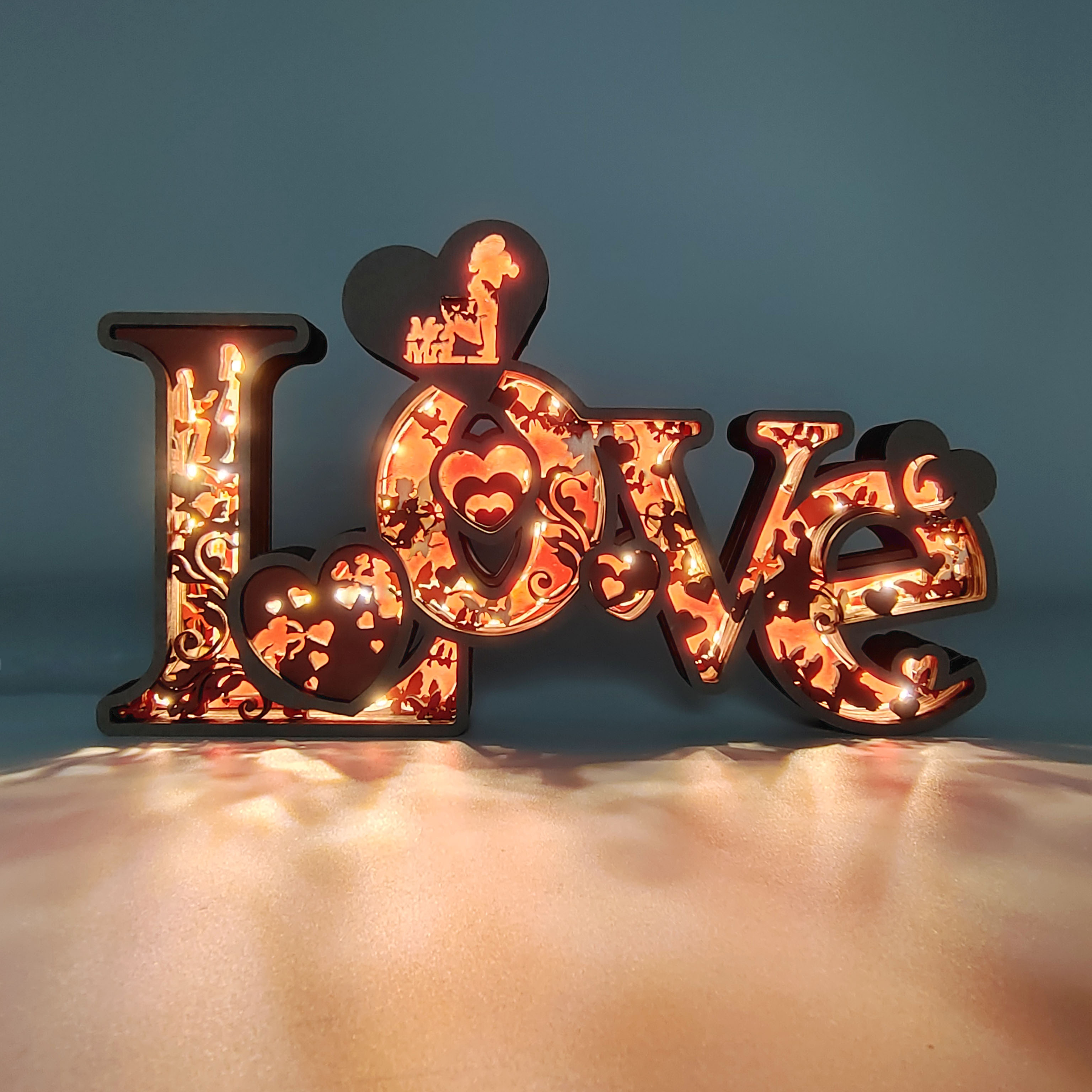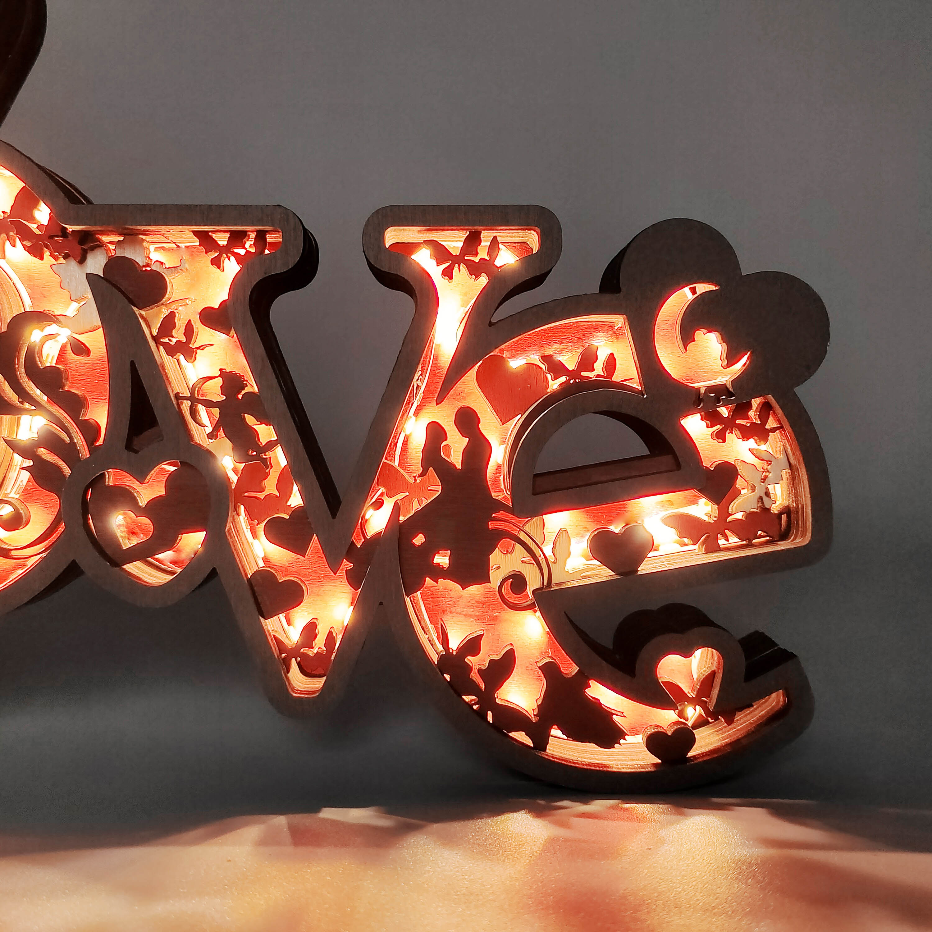 Love, cupid, rose,moon, hugs, this wooden night light describes a sweet picture.